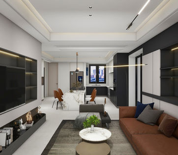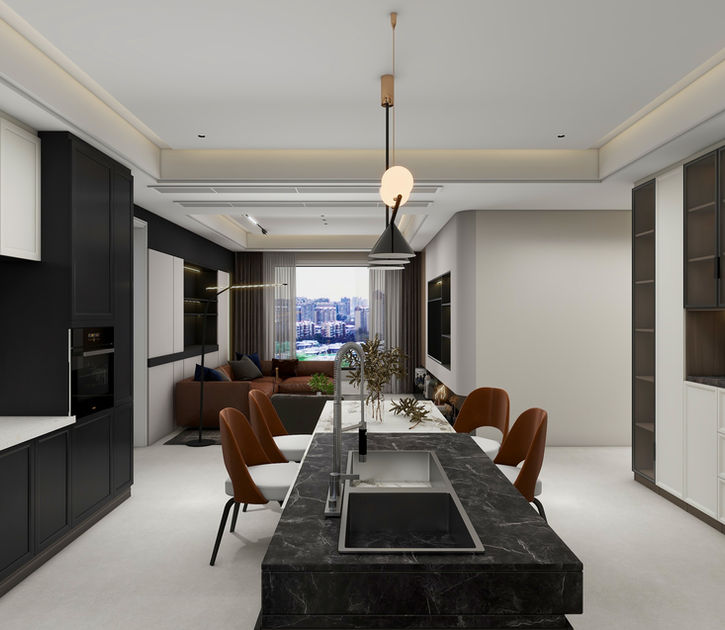 This open-concept space beautifully balances warmth and modern edge through a Beige & Black interior palette. Soft beige walls and natural wood finishes wrap the living area in cozy comfort, inviting relaxation and conversation. Black accents—seen in sleek light fixtures, minimalist furniture legs, and picture frames—introduce striking contrast and visual depth without overpowering the serenity. The dining area features a warm wooden table complemented by black chairs, creating an elegant yet approachable setting for meals and gatherings. In the kitchen, beige cabinetry and countertops harmonize with black hardware and appliances, blending functionality with refined style. Together, these rooms create a seamless flow that feels both timeless and contemporary—calm, inviting, and sophisticated in every detail.
