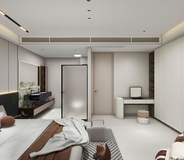 This thoughtfully designed space blends relaxation and functionality with a Beige & Black palette. The bedroom area features soft beige walls, natural wood textures, and cozy textiles that create a peaceful, inviting retreat. Bold black accents—like a sleek headboard, lamps, and frames—add modern sophistication and visual contrast. Adjacent to the sleeping area, the mini gym integrates seamlessly with black workout equipment and matte finishes, balanced by warm beige walls and natural light to keep the space energizing yet harmonious. Together, the bedroom and gym form a balanced environment where calm meets motivation, perfect for rest and active living within a stylish, cohesive design.